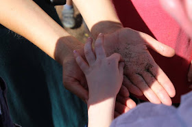 Moi, démontrant à des enfants lors d’un cours de butinage, comment on expose les graines