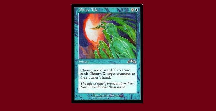 De az Aether Tide kijátszásában nincs semmi előny. Komolyan, nincs! First strike: sorcery speed (tehát nem lehet defensíven használni). Második csapás: lehet, hogy a végén sok manát kell fizetned. Harmadik és legnagyobb csapás: minden olyan lény után, akit ezzel az Aether Tide-dal célba veszel, el kell dobnod egy lénykártyát! Micsoda? Mióta van a kék pakliknak tele a kezük lényekkel, hogy ilyen varázslatokat tápláljanak? Merfolk paklik? Ez egy marginális eset, és komolyan, a Merfolk sokkal jobbat is tud. Az Aether Tide hatásainak költségei enyhén szólva is hátborzongatóak.