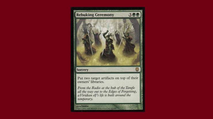 Nerfing egy erős stratégia rendben van, de Rebuking Ceremony nem próbálkozik eléggé. A zöld imádja elpusztítani az artefaktokat! Mit csinál ez a kártya, csak visszapattintja őket a könyvtár tetejére? Még ha ez kettő az egyért is, ez nonszensz, és mindezért 3GG-t fizetni (ráadásul varázslatsebességgel) egyszerűen túl sok. Próbáld inkább a Reclamation Sage-t.