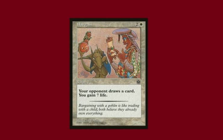 Ez a kártya egy alku, rendben… az ellenfeled számára! A fehér a leggyengébb szín kártyahúzásban, és a legjobb életnyerésben, de ez egyszerűen butaság. Fizetsz 2W-ot varázslatsebességgel, hogy 7 életet nyerj, ami eléggé jelentéktelen.
