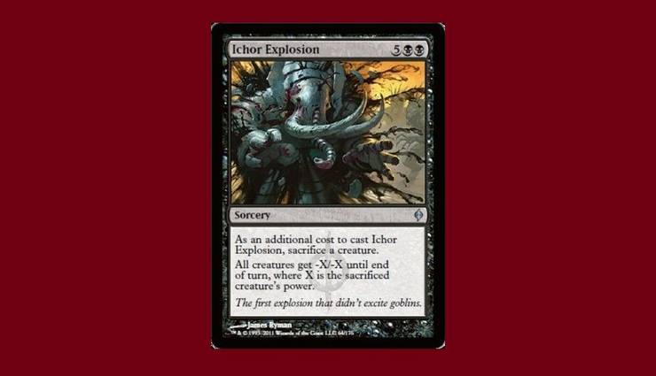A New Phyrexia-ból frissen érkezett Ichor Explosion feláldozza a funkciót az ízlésért, és a Phyrexiaiak tényleg cserben hagynak minket. Kezdjük azzal, hogy potom 5BB-t adunk ezért a lapért, és ez komoly dolog. De egy lényt is fel kell áldoznunk, és annak nagyon erősnek kell lennie ahhoz, hogy ez a kártya jól működjön! Hűha, ugyanebben a készletben volt Life’s Finale, ami 4BB-be került, és büntetlenül törölte a táblát. Hogy lehet ezt egyáltalán összehasonlítani? Ez egy olyan robbanás, ami sem a goblinokat, sem a játékosokat nem izgatja.