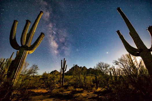 Mi piace molto poter fotografare immagini di paesaggi al buio. Uno dei miei soggetti preferiti è la Via Lattea. Vivo in Arizona e mi dirigo nel deserto in uno dei miei giardini di cactus preferiti ogni volta che ci avviciniamo alla luna nuova (la fase della luna quando è in congiunzione con il sole e invisibile dalla terra, o poco dopo quando appare come una sottile mezzaluna) poiché durante queste fasi della luna è quando la Via Lattea è più visibile.