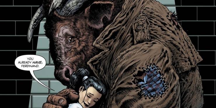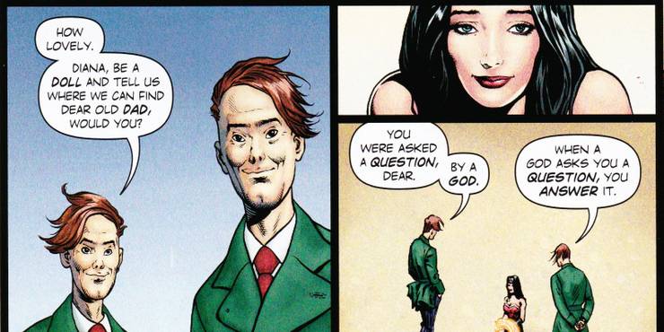 The Lies and The Truthでは、ダイアナは、彼女にとってすべてが現実であるとして、自分のさまざまな起源物語を区別することができませんが、詳細があまりにも矛盾しているので、そうであるはずがないのです。 やがて、その心理的ストレスがダイアナを圧倒し、彼女は完全に狂ってしまい、精神病院に入院することになります。 しかし、そんな彼女のもとに、昔からの親友である “キツネザル “のフェルディナンドが現れ、彼女を抱きしめてくれる。 彼の愛は、たとえ過去が完全に解決されていなくても、彼女が前に進むための拠り所となります。