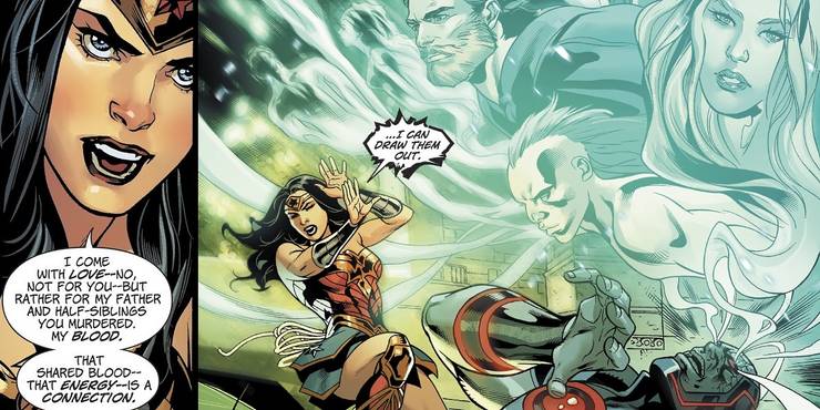 Istället för att bekämpa honom med mörker sträcker Wonder Woman ut sig till den andliga koppling (och blodkoppling) som hon delar med sin gudfruktiga familj, övertygad om att de fortfarande måste existera även efter att Darkseid absorberat deras essens. Det är en bra teori, eftersom de alla kommer ut ur skurken i en spöklik grupp och verkar ta ner Darkseid i processen. Det är ett passande slut på denna ark (för tillfället), då Wonder Woman får ta ett sista farväl av sin far och bevisa att hon kan besegra en så mäktig person som Darkseid utan att Justice League backar upp henne.
